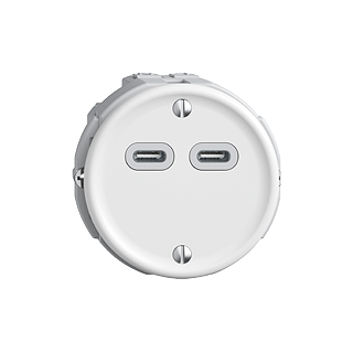 USB-Ladesteckdose • 230 V AC • Ausgangsleistung 18 W • Es können bis zu 2 Geräte parallel angeschlossen werden • Leistungsaufnahme (Standby) max. 100 mW • Überlastsicher und kurzschlussfest • 2 USB-Anschlüsse Typ C • Ausgangsspannung 5-12 V DC • Mit Steckklemmen • Frontscheibe 53 mm, für Bohrung 50 mm • Einbautiefe 41 mm • Q • weiss • IP20 • Befestigungsdistanz 52 mm