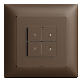 Wiser Storenschalter 1-Kanal Szene •  2 Schaltkontakte, je 2 A, 230 V AC •  Für 1 Antrieb bis 460 VA mit Endschalter (Rolladen, Storen, Lamellenstoren, Markise) •  Die Szenentaste ermöglicht das Speichern und Abrufen von Szenen •  Mit Steckklemmen •  Beleuchtbar mit integrierter LED •  4 Tasten •  Einbautiefe 36 mm •  FMI •  coffee •  IP20 •  88 x 88 mm