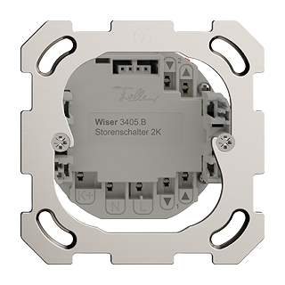 Funktionseinsatz Wiser Storenschalter 2-Kanal • 4 Schaltkontakte, je 2 A, 230 V AC • Funktionsfähig mit Wiser Bedienaufsatz • Für 2 Antriebe bis 460 VA mit Endschalter (Rolladen, Storen, Lamellenstoren, Markise) • Mit Steckklemmen • Einbautiefe 36 mm • BSM • IP20