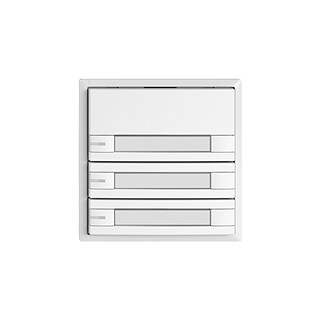 EDIZIO.liv • UNI-Taster • 12-48 V DC / 12-36 V AC • Schaltstrom min 1 mA, max. 50 mA • Max. 14 L • Mit Schraubklemmen • Mit LED Blau • Mit Papiereinlage • Dreifach-Taste • 2-Tastenbedienung • SNAPFIX® Befestigungssystem • Einbautiefe 17 mm • G.A • weiss • IP20 • 60 x 60 mm