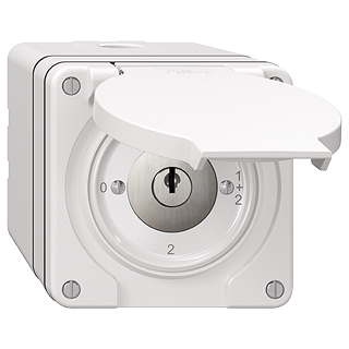 Drehschalter • Mit Sicherheitsschloss und 2 Schlüsseln • 16 A, 240/400 V AC • Mit Schraubklemmen • LED-Last max: 200 W • Frontscheibe 60 mm, für Bohrung 60 mm • Serieschalter • 1/1 L • KS 0 - 1 - 1+2 - 2 • Anbauhöhe 93 mm • NAP.Q • weiss • IP55 • 87 x 87 mm • Schlagfestigkeit: IK07 • 4 Abzugsstellungen