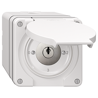 Drehschalter • Mit Sicherheitsschloss und 2 Schlüsseln • 16 A, 240/400 V AC • Mit Schraubklemmen • LED-Last max: 200 W • Frontscheibe 60 mm, für Bohrung 60 mm • Mehrfachumschalter • 5/1 L • KS 0 - 1 - 2 -3 • Anbauhöhe 93 mm • NAP.Q • weiss • IP55 • 87 x 87 mm • Schlagfestigkeit: IK07 • 4 Abzugsstellungen