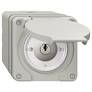 Drehschalter • Mit Sicherheitsschloss und 2 Schlüsseln • 16 A, 240/400 V AC • Mit Schraubklemmen • LED-Last max: 200 W • Frontscheibe 60 mm, für Bohrung 60 mm • Mehrfachumschalter • 5/2 L • KS 0 - 1 - 2 -3 • Anbauhöhe 93 mm • NAP.Q • lichtgrau • IP55 • 87 x 87 mm • Schlagfestigkeit: IK07 • 4 Abzugsstellungen