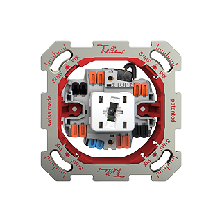 Das zweistufige Befestigungssystem Feller SNAPFIX® reduziert die Planungs-, Bestellund Installationsarbeit dank einem symmetrischen Einheitsausschnitt in der Befestigungsplatte und dem roten Adapter am Funktionseinsatz. Dieser wird in die Befestigungsplatte eingeschnappt (SNAP) und anschliessend werden die vier Schnapper an den Ecken mit dem Schraubenzieher Nr. 2 fixiert (FIX). Feller SNAPFIX® ist modular aufgebaut und funktioniert für alle Feller Funktionen.