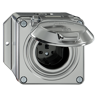 ELEMENT • Steckdose Typ 25 • 16 A, 250 V AC, L + N + PE • 16 A, 440 V AC, 3 L + N + PE • Mit Steckklemmen • Frontscheibe 53 mm • SNAPFIX® Befestigungssystem • Anbauhöhe 88 mm • GAP.Q.A • aluminium • IP55 • 96 x 111 mm
